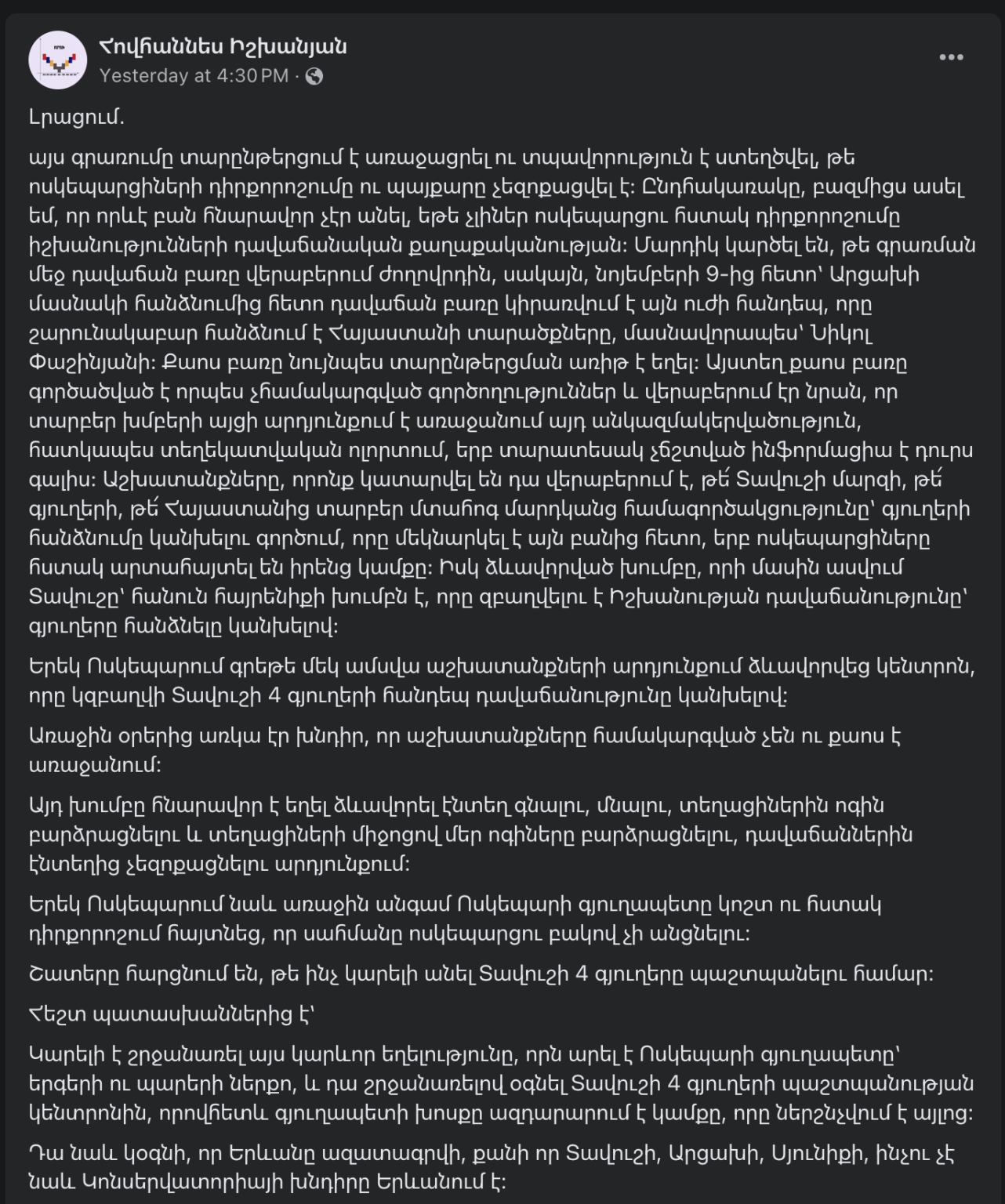 Վերջերս մեր՝ Ոսկեպար գյուղի և նրա շուրջ ծավալված իրադարձությունների կապակցությամբ համացանցում, լրատվամիջոցներում հակասական տեղեկություններ են տարածվում գյուղի և իմ՝ վարչական ղեկավարի անունից, որոնք հաճախ ոչ միայն չեն համապատասխանում իրականությանը, այլ հակասում են մեր դիրքորոշմանը և կարծիքին։ Ուստի հետագայում նման ապատեղեկատվությունից, տարըմբռնումից և հակասական մեկնաբանություններից խուսափելու նպատակով մեկ անգամ ևս հայտարարում եմ, որ մեր համայնքի և մեր դիրքորոշումը, մնում է նույնը։