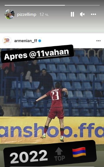 Վերջինիս գոլին արձագանքել է մեր հավաքականի նախկին ֆուտբոլիստ Մարկոս Պիզելին՝ Instagrami-ի իր պատմություններ բաժնում տեղադրելով կադր, որտեղ Վահանը տոնում է իր գոլը։