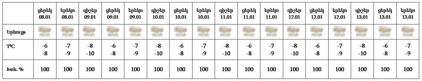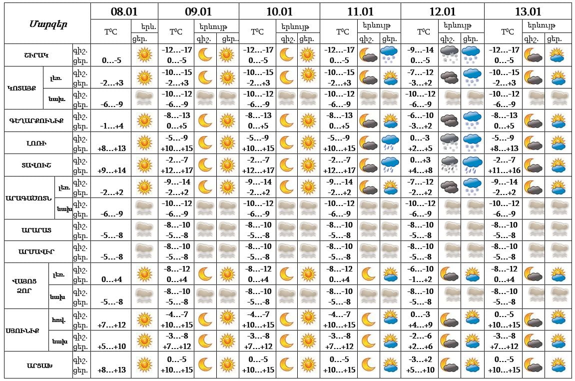 Հունվարի 8-ի ցերեկը, 9-10-ը, 11-ի գիշերը, 13-ին սպասվում է առանց տեղումների եղանակ։ Հունվարի 11-ի ուշ երեկոյան, 12-ին հյուսիսային շրջաններում սպասվում են թույլ տեղումներ։ Արարատյան դաշտում, Արագածոտնի, Կոտայքի և Վայոց ձորի նախալեռներում սպասվում է ամպամածություն և մառախուղ, մառախուղից՝ թույլ ձյուն։