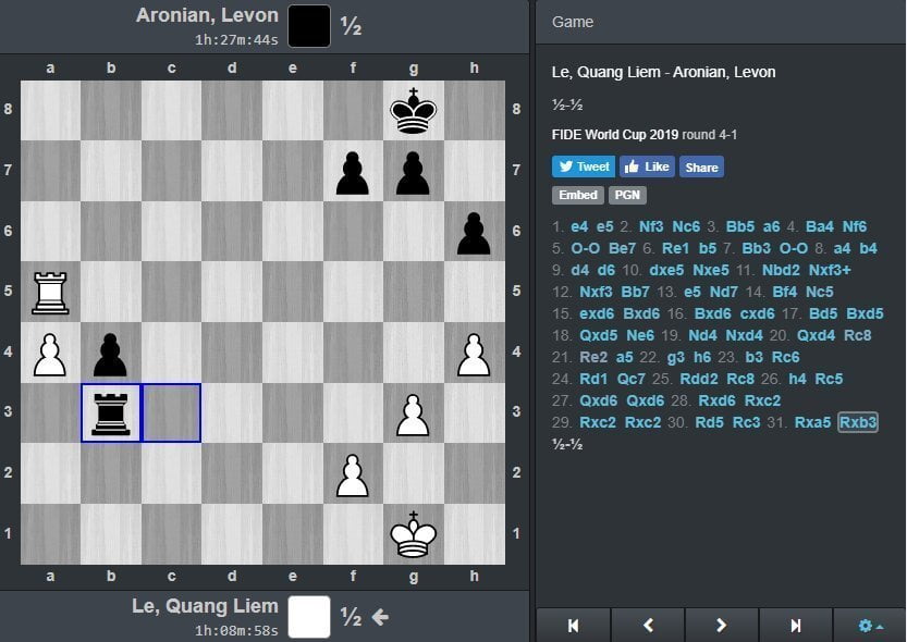 Այսօր՝ սեպտեմբերի 20-ին, Արոնյանը 4-րդ շրջանի առաջին պարտիան է անցկացրել Վիետնամը ներկայացնող Լե Քուանգ Լյեմի հետ։ Հայ գրոսմայստերը սև խաղաքարերով էր։ Խաղն անցել է չափազանց հավասար պայքարում ու արագ տեղափոխվելով նավակային վերջնախաղ՝ ստիպել է կողմերին ոչ-ոքի համաձայնվել։