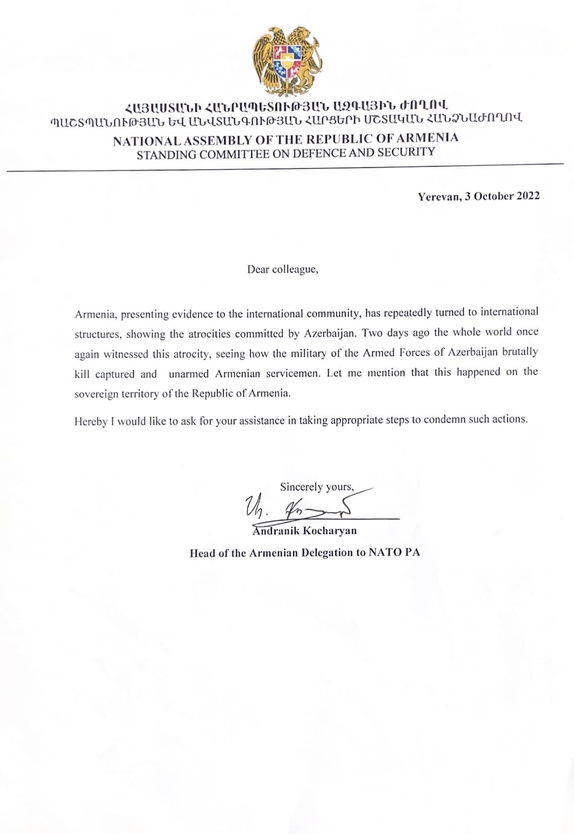 Այսօր՝ հոկտեմբերի 3-ին, ՀՀ ԱԺ պաշտպանության և անվտանգության հարցերի մշտական հանձնաժողովի նախագահ Անդրանիկ Քոչարյանը գրությունով դիմել է ՆԱՏՕ-ի անդամ պետությունների իր կոլեգաներին՝ ներկայացնելով Ադրբեջանի ԶՈԻ-ի կողմից արված վայրագությունները հայ զինծառայողների նկատմամբ և կոչ արել ձեռնարկել համապատասխան քայլեր նմանօրինակ անմարդկային գործողությունները դատապարտելու վերաբերյալ: