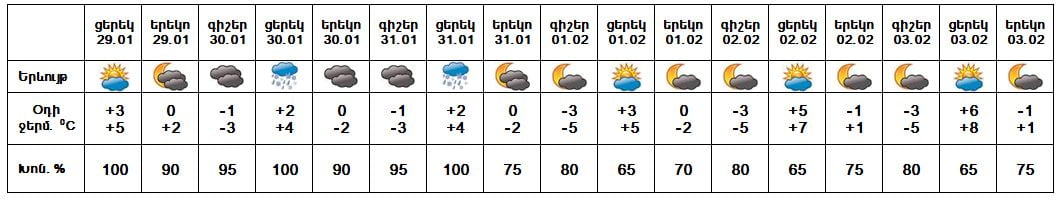 Հունվարի 29-ի ցերեկը, 30-ի և 31-ի գիշերը, փետրվարի 1-3-ը սպասվում է առանց տեղումների եղանակ։ Հունվարի 30-ի և 31-ի ցերեկը սպասվում է թույլ տեղումներ։