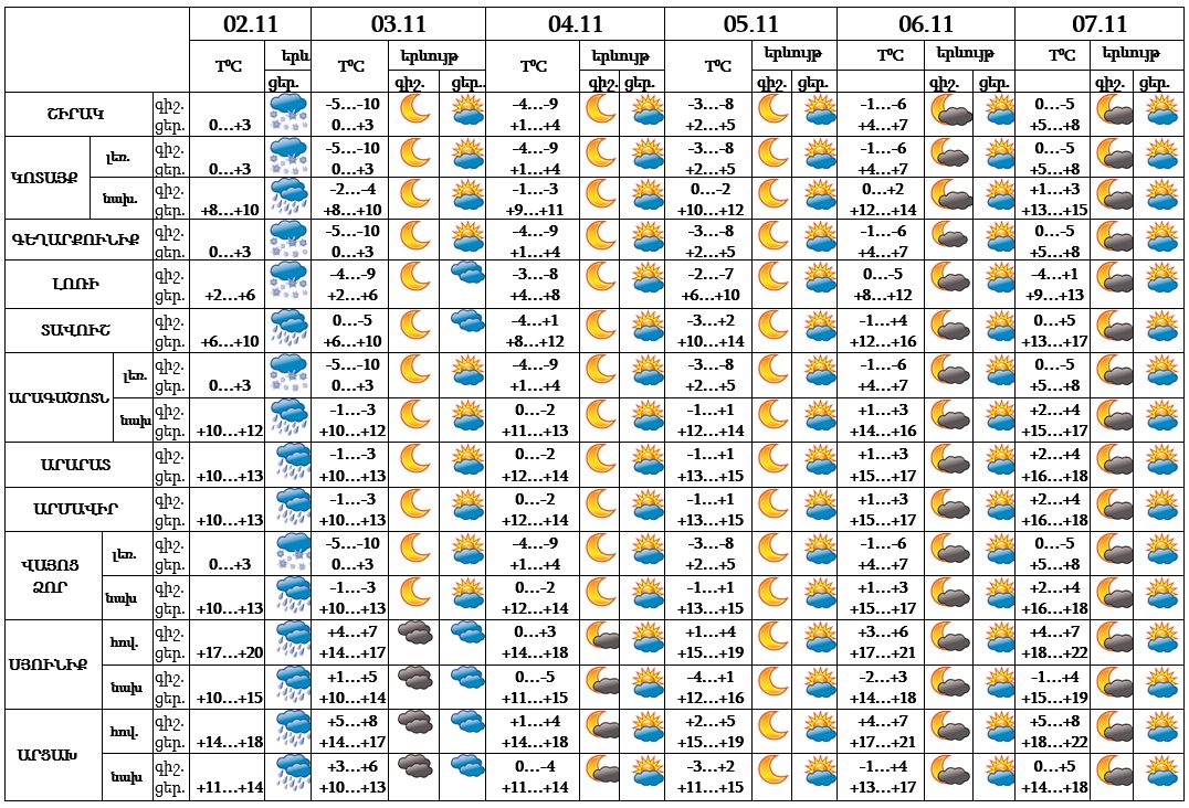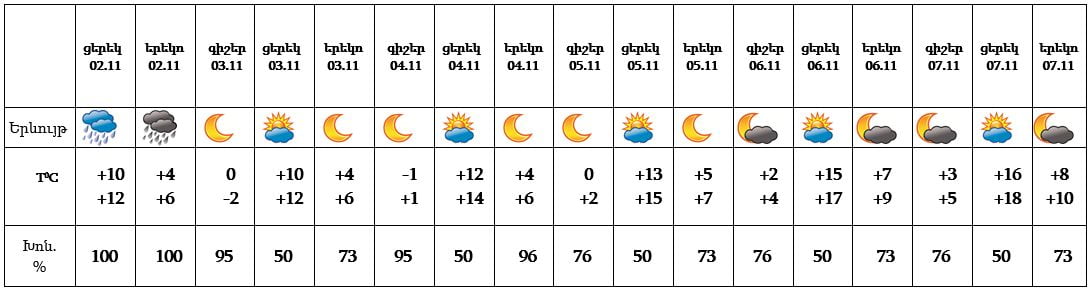 Օդի ջերմաստիճանը նոյեմբերի 2-ի ցերեկը և 3-ի գիշերը կնվազի 8-10 աստիճանով, 4-7-ն աստիճանաբար կբարձրանա 7-9 աստիճանով: