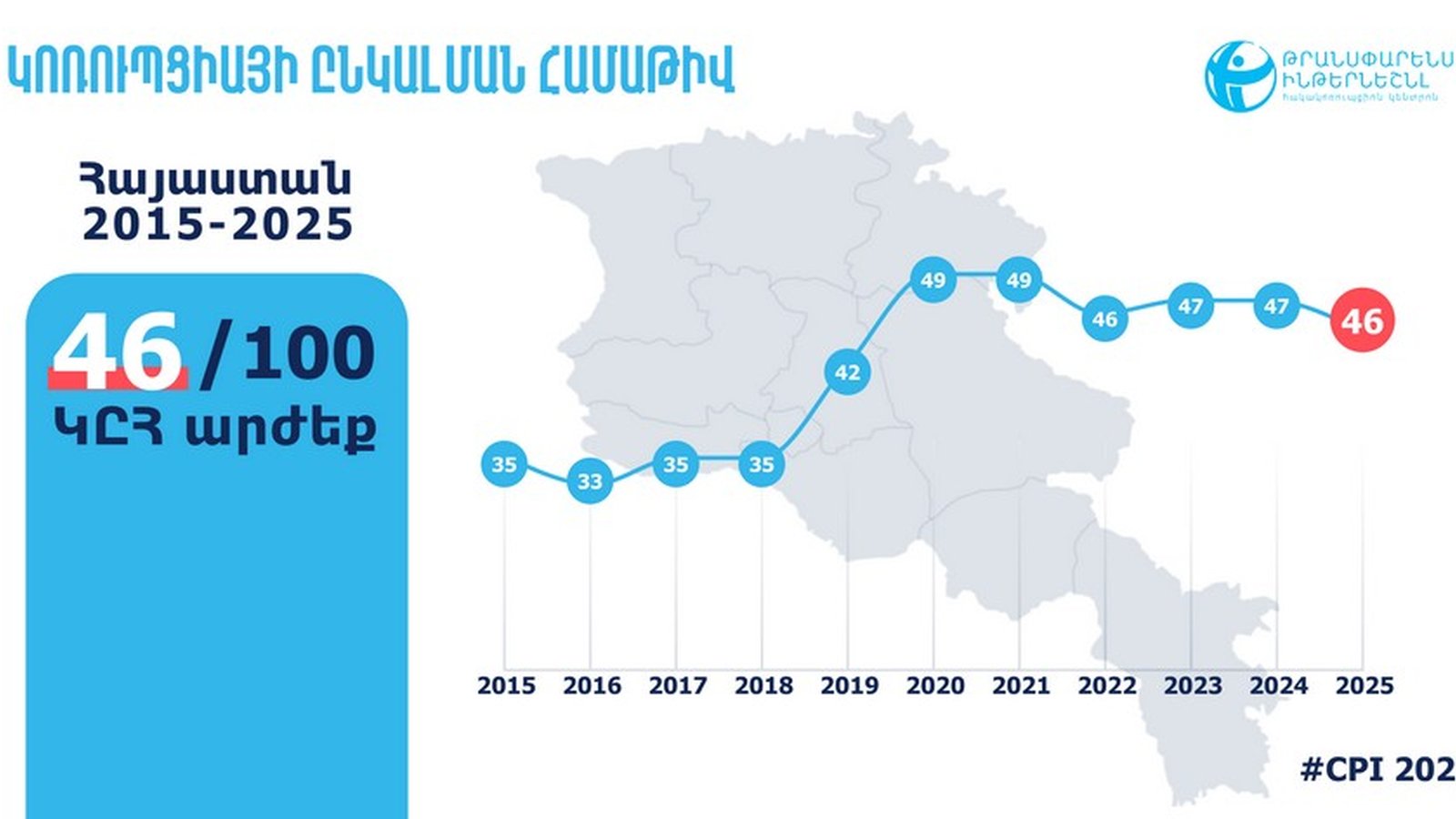 - Armenia’s 2025 CPI score drops to 46, down one point from 2024.