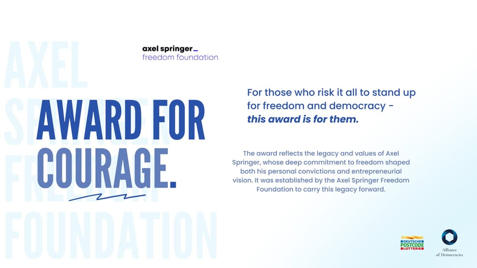 The Axel Springer Freedom Foundation and the Alliance of Democracies Foundation are joining forces to present the Award for Courage at the upcoming 8th Copenhagen Democracy Summit. The summit is scheduled to take place on May 13-14, 2025, hosted by the Alliance of Democracies Foundation. The collaboration was announced on April 25, 2025.