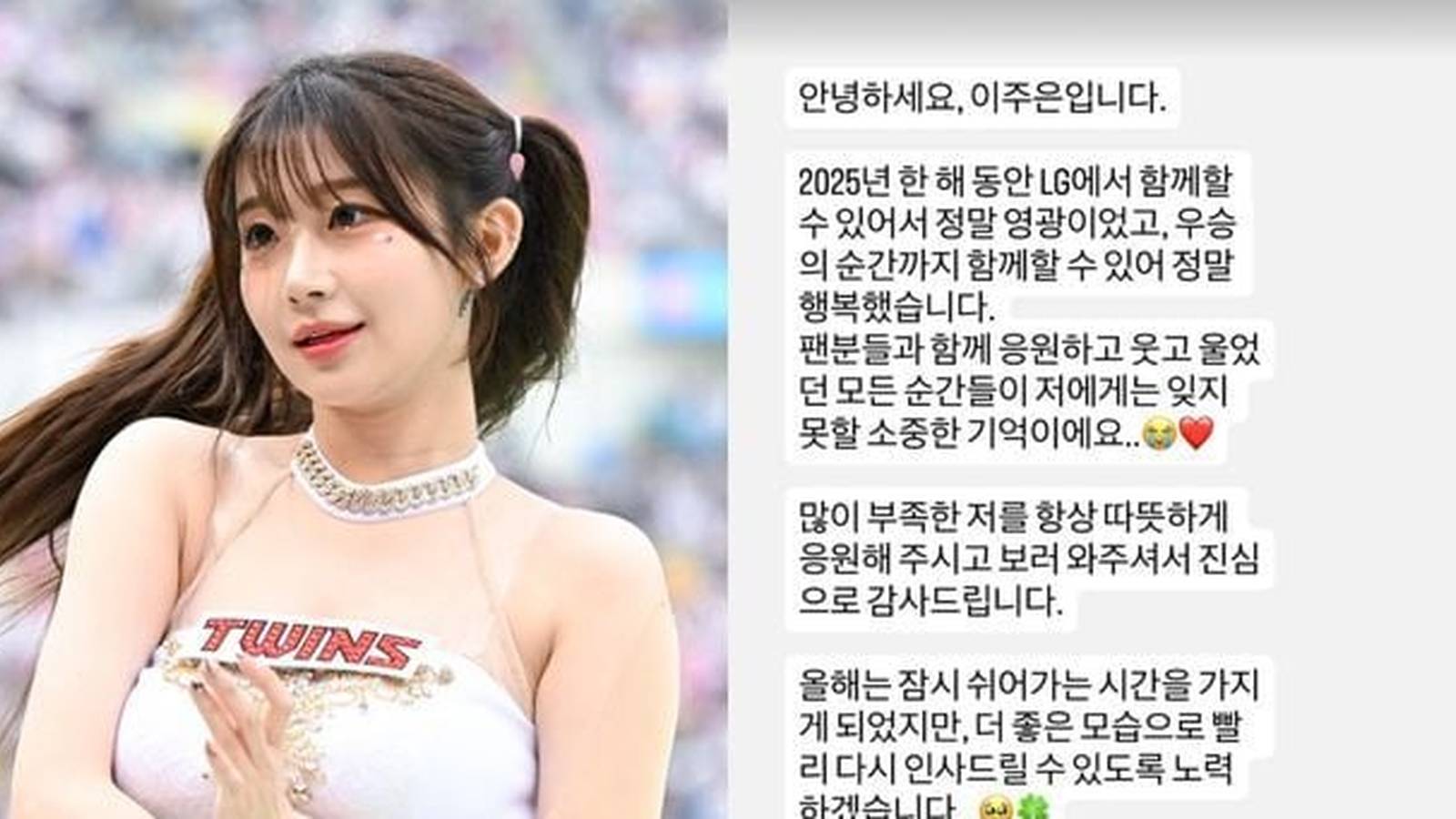 SEOUL (Azat TV) – Cheerleader Lee Joo-eun, a prominent figure in the Korean sports entertainment circuit, has officially announced her decision to step away from cheerleading for the 2026 season. The move comes as a significant surprise to fans, following her high-profile 2025 campaign that saw her contribute to a championship-winning year with the LG Twins.