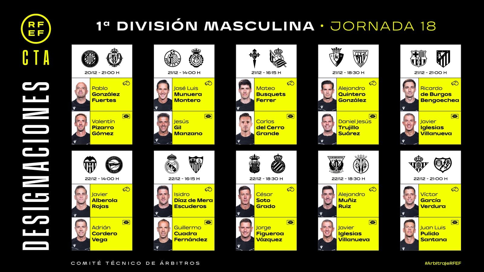 The Spanish Football Federation’s (RFEF) Technical Committee of Referees released the matchday officiating assignments on Thursday. Among them, Isidro Diaz de Mera Escuderos, representing the Castilla La Mancha Committee, will oversee the Real Madrid-Sevilla clash, with Guillermo Cuadra Fernandez from the Balearic Islands acting as the VAR official.