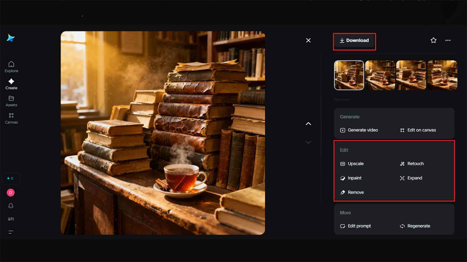Dreamina provides powerful AI tools to customize your rich-sensory visuals. Feel free to inpaint forgotten objects, expand to widen the scene, remove clear distractions, or retouch and intensify textures and colors that deepen nostalgia. Once you are satisfied, hit the “Download” icon and save your finished artwork—your memory, now made visual.