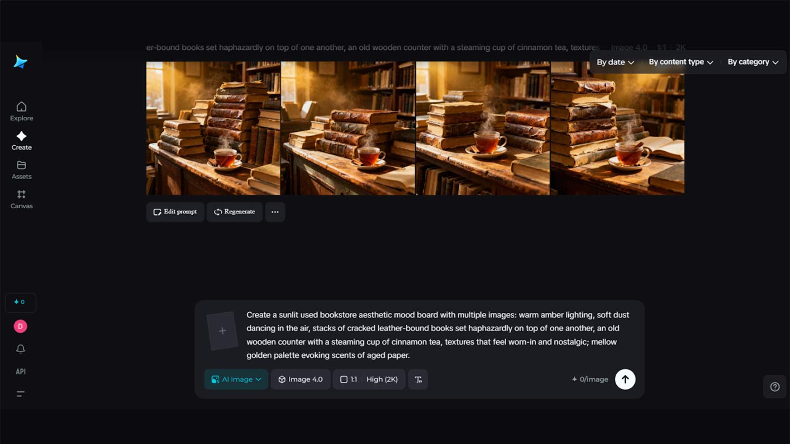 Sample prompt: A sunlit used bookstore: warm amber lighting, soft dust dancing in the air, stacks of cracked leather-bound books set haphazardly on top of one another, an old wooden counter with a steaming cup of cinnamon tea, textures that feel worn-in and nostalgic; mellow golden palette evoking scents of aged paper.