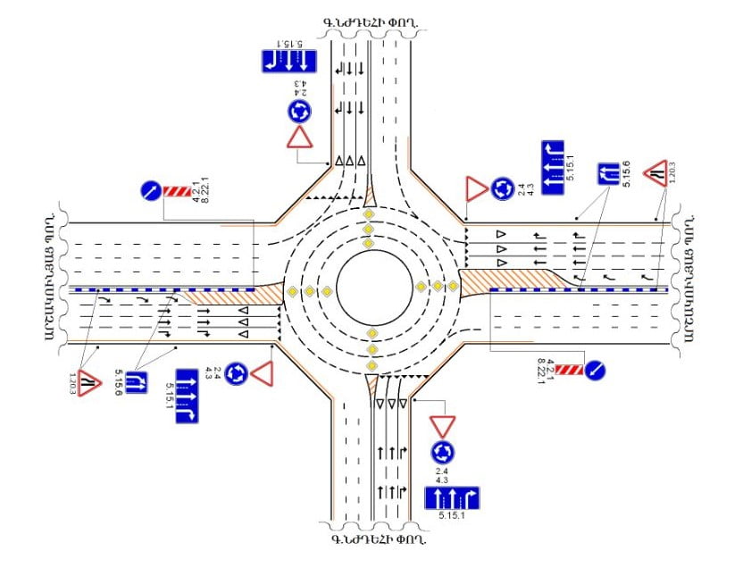 Նշված խաչմերուկում ռետինե կարճասյուների միջոցով կտեղակայվի համապատասխան տրամագծով շրջան և երթևեկությունը կկազմակերպվի շրջանաձև, իսկ լուսացույցերը կաշխատեն դեղին թարթող ռեժիմով: