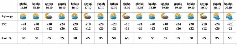 Հոկտեմբերի 15-ի ցերեկը, 16-20-ը սպասվում է առանց տեղումների եղանակ:
