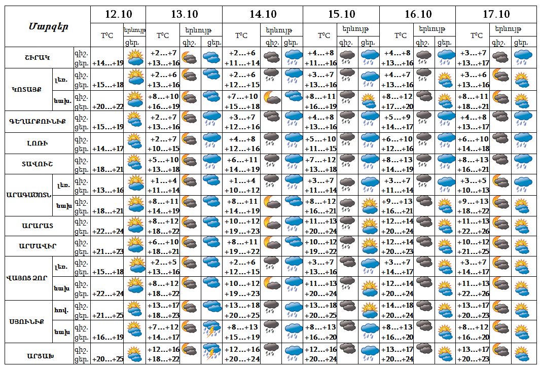 Հոկտեմբերի 13-ի գիշերը, սպասվում է առանց տեղումների եղանակ: Հոկտեմբերի 13-ի ցերեկը, 14-17-ը առանձին շրջաններում սպասվում է անձրև, 13-ի ցերեկը հնարավոր է նաև ամպրոպ: