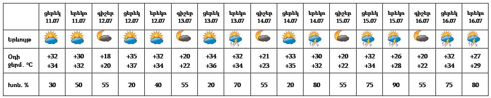 Հուլիսի 11-ի ցերեկը, 12-ին սպասվում է առանց տեղումների եղանակ: Հուլիսի 13-14-ի երեկոյան ժամերին, 15-16-ի ցերեկը սպասվում է կարճատև անձրև և ամպրոպ, ամպրոպի ժամանակ՝ քամու ուժգնացում՝ 15-20 մ/վ: