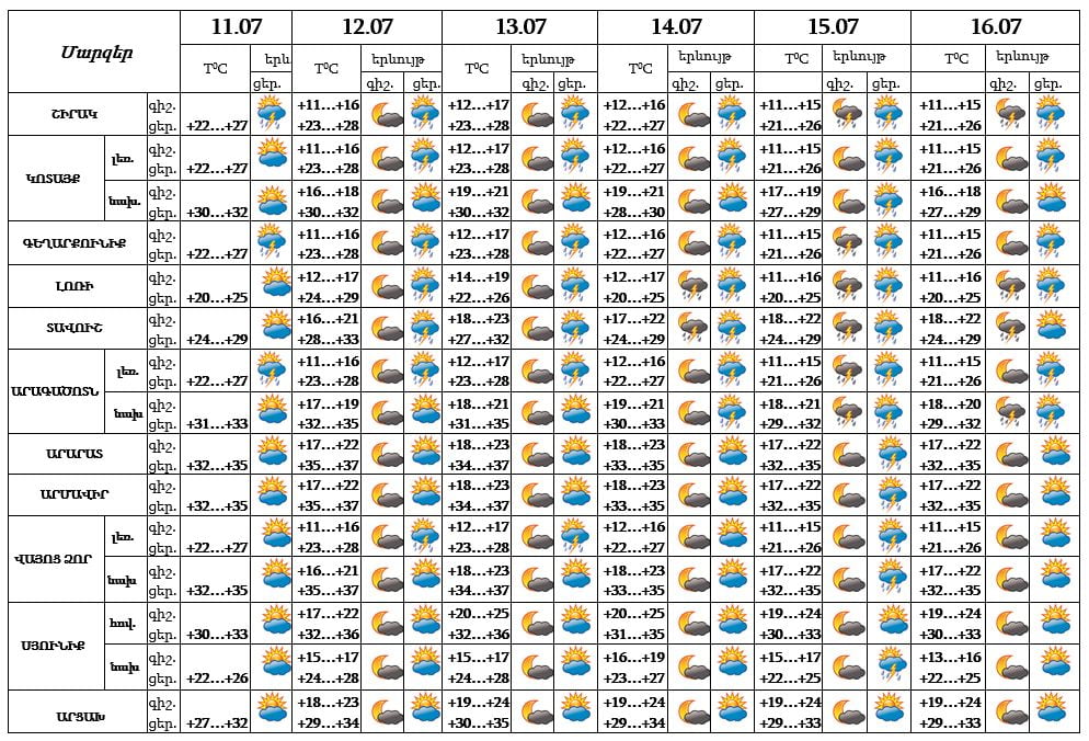 Հուլիսի 11-16-ին՝ հիմնականում կեսօրից հետո և գիշերը, առանձին շրջաններում սպասվում է անձրև և ամպրոպ, առանձին հատվածներում նաև կարկուտ։