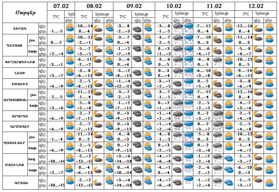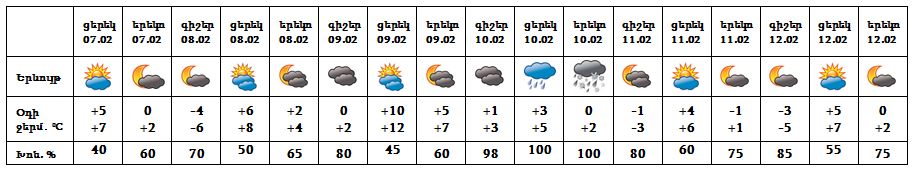 Փետրվարի 8-9-ը, 11-12-ը սպասվում է առանց տեղումների եղանակ: Փետրվարի 10-ին սպասվում են տեղումներ: