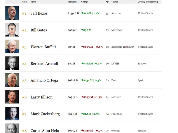 Երկրորդ տեղում Բիլ Գեյթսն է՝ 97․9 մլրդ դոլար կարողությամբ, եռյակը եզրափակում է Ուորեն Բաֆեթը՝ 83 մլրդ դոլար հարստությամբ։
