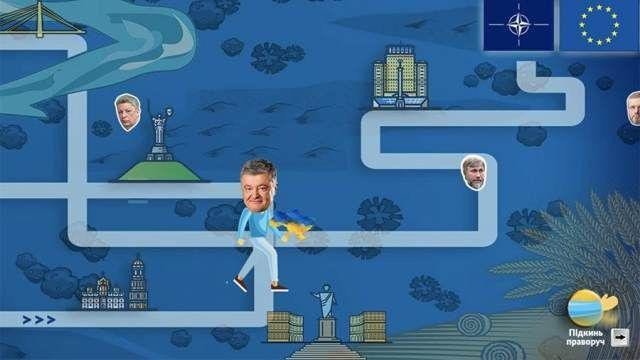 Խաղում Պորոշենկոն վազում է նախանշված ճանապարհով և հարվածում իր քաղաքական հակառակորդներին: Նրանց թվում է նաև բիզնեսմեն Իգոր Կոլոմոյսկին, ինչպես նաև «Հեղափոխական հարթակ. հանուն կյանքի» կուսակցության ղեկավար Յուրի Բոյկոն: Խաղի վերջնամասում հերոսին սպասում են Եվրամիության և ՆԱՏՕ-ի դրոշները: