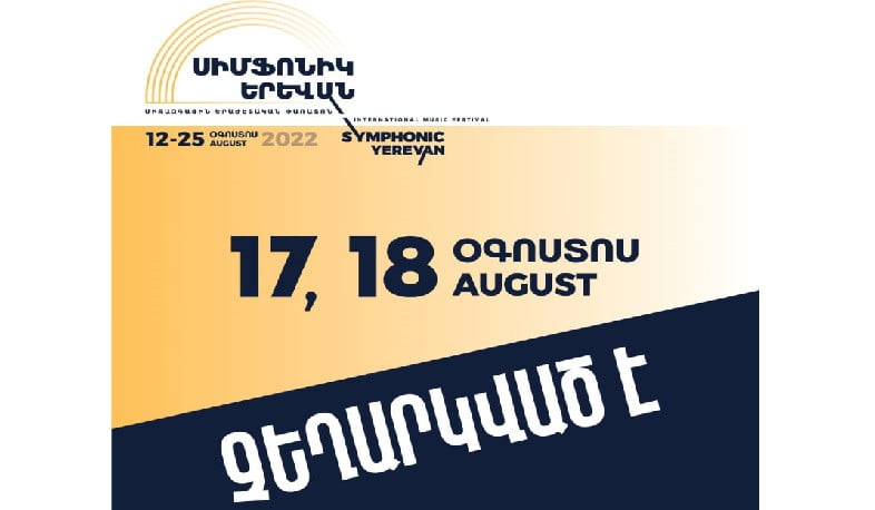 Հայաստանի սիմֆոնիկ նվագախմբի լրատվական բաժնից տեղեկացնում են, որ «Սիմֆոնիկ Երևան» միջազգային երաժշտական փառատոնի օգոստոսի 17-ի և 18-ի համերգները չեղարկվել են: