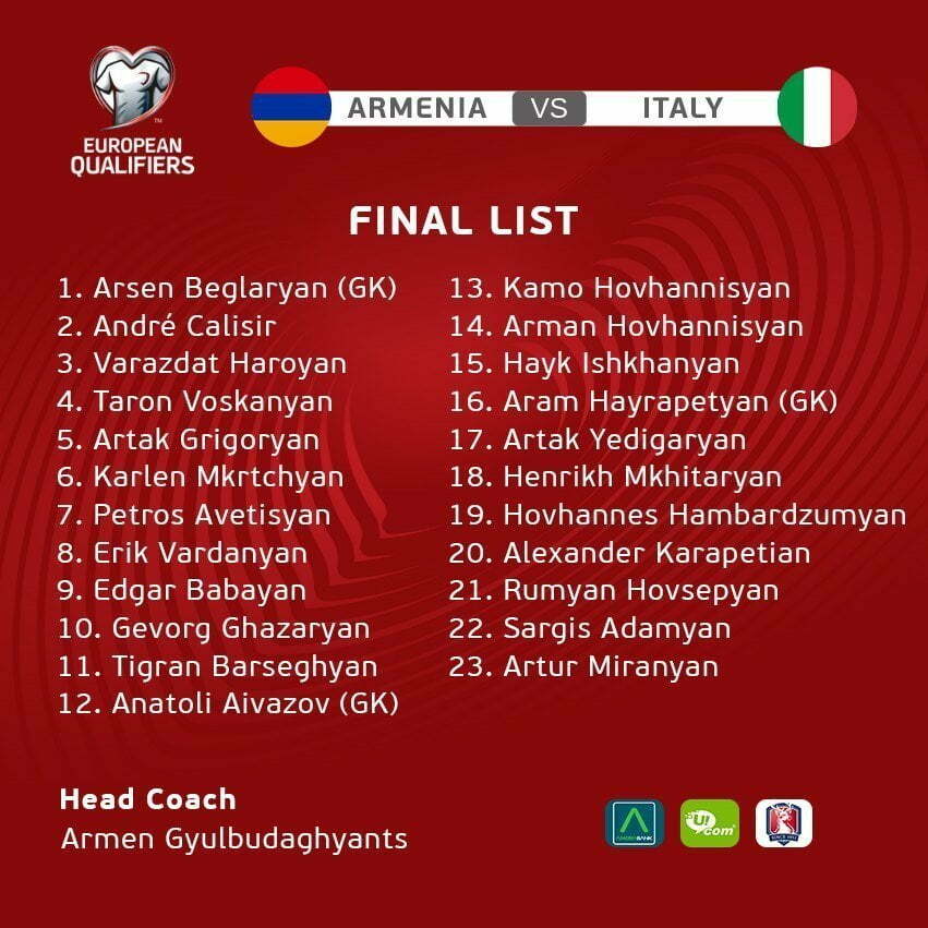 Հայաստանի ֆուտբոլի ֆեդերացիայի Facebook-յան պաշտոնական էջը հրապարակել է Հայաստան – Իտալիա Խաղի մեր հավաքականի հայտացուցակը, որը ներկայացնում ենք ստորև․