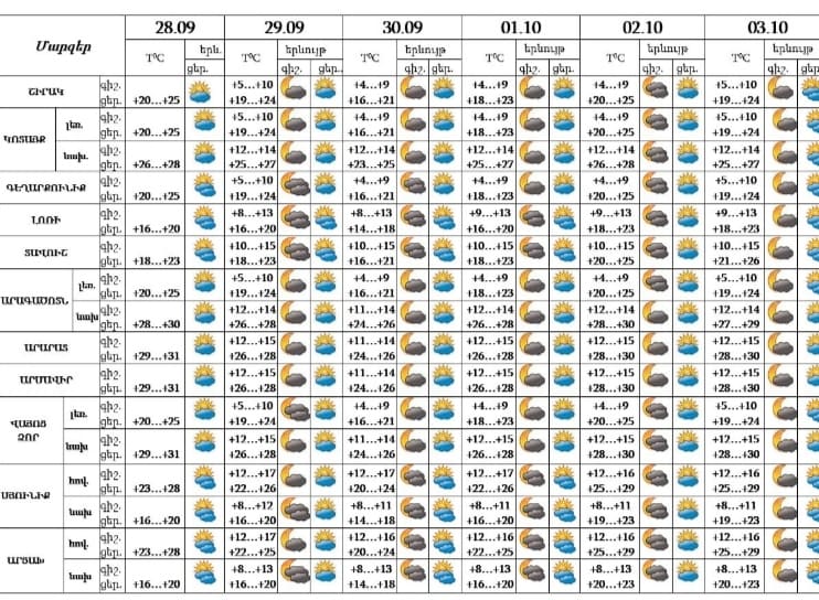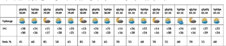 Սեպտեմբերի 28-ի ցերեկը, 29-30-ը և հոկտեմբերի 1-3-ը սպասվում է առանց տեղումների եղանակ: