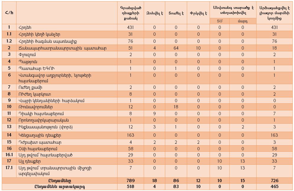 Նշված ժամանակահատվածում արձանագրվել է 163 կենցաղային կանչ, 431 հրդեհ, 51 ճանապարհատրանսպորտային պատահար, որի հետևանքով զոհվել է 4 և տուժել 64 մարդ, իսկ փրկարարական օպերատիվ գործողությունների արդյունքում՝ փրկվել 10 քաղաքացի:
