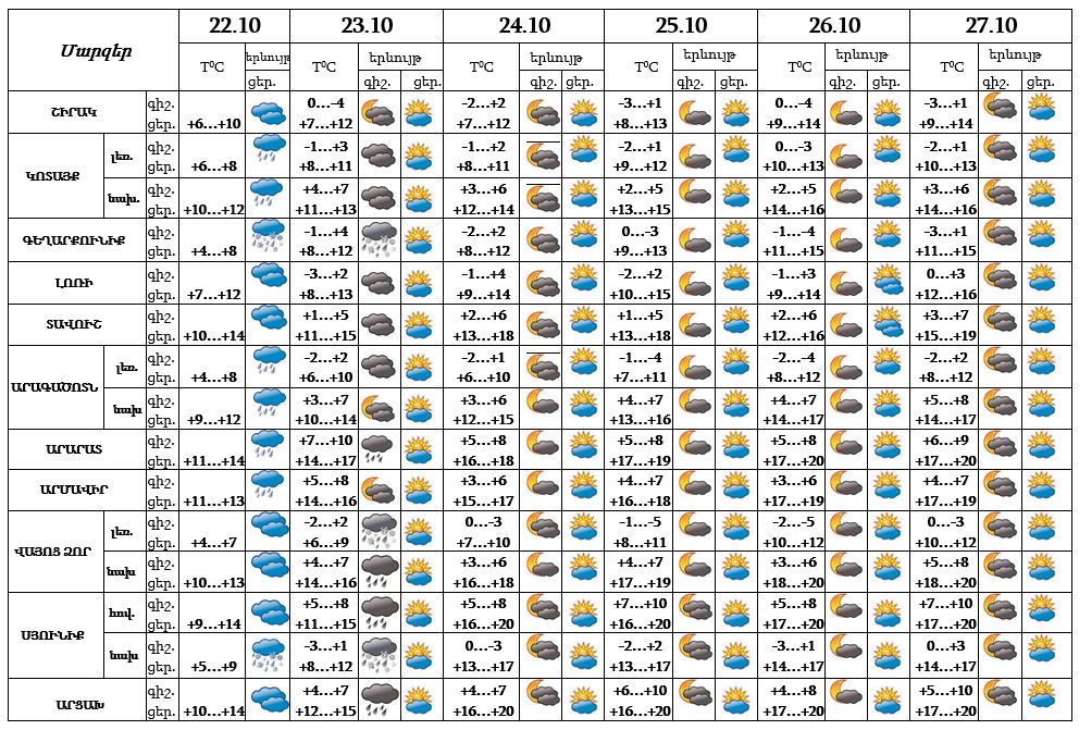 Հոկտեմբերի 23-ի գիշերն առանձին շրջաններում սպասվում են տեղումներ, առանձին լեռնային շրջաններում՝ թաց ձյան տեսքով։ Հոկտեմբերի 23-ի ցերեկը, 24-27-ը սպասվում է առանց տեղումների եղանակ: