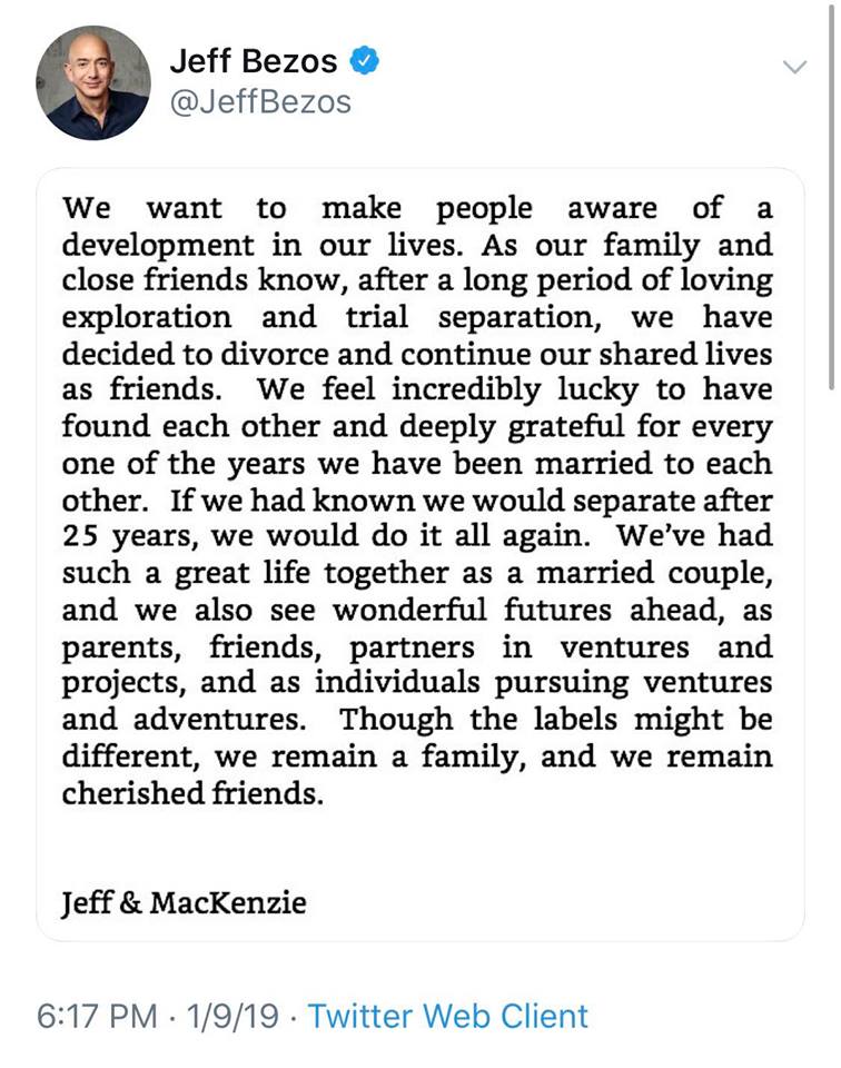Ջեֆը գրել է. «Մենք որոշել ենք բաժանվել և շարունակել մեր համատեղ կյանքը որպես ընկերներ: Եթե մենք իմանայինք, որ 25 տարի անց կբաժանվենք, ապա դա կանեինք վաղուց»։