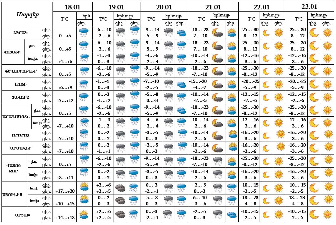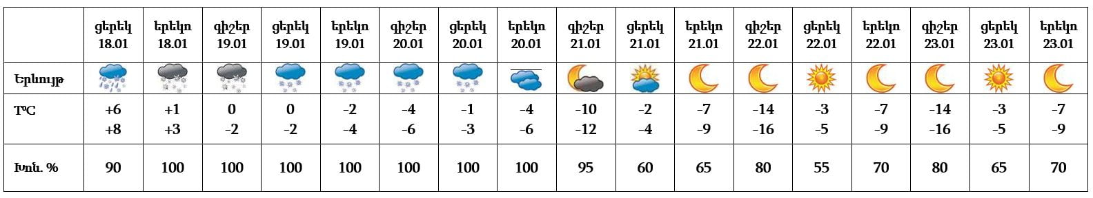 Հունվարի 18-19-ը, 20-ին ժամանակ առ ժամանակ սպասվում են տեղումներ, 19-ից՝ ձյան տեսքով։ Հունվարի 21-23-ը սպասվում է առանց տեղումների եղանակ։ Հունվարի 19-21-ը ճանապարհներին սպասվում է մերկասառույց։