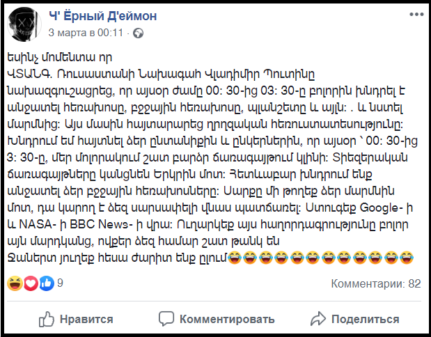 Հայտարարությունն այս տարի առաջին անգամ արվել էր դեռևս մարտի 3-ին՝ Ч’ Ёрный Д’еймон անունով կեղծ օգտատիրոջ կողմից, սակայն լայնորեն սկսեց տարածվել մարտի 27-ին՝ անձնական հաղորդագրությունների և ֆեյսբուքյան գրառումների տեսքով։ Այս անգամ ևս հղում էր արված BBC-ին և Օդագնացության ու տիեզերական տարածության հետազոտությունների ազգային գործակալությանը (NASA), որոնցից որևէ մեկը նման ինֆորմացիա չէր հաղորդել։