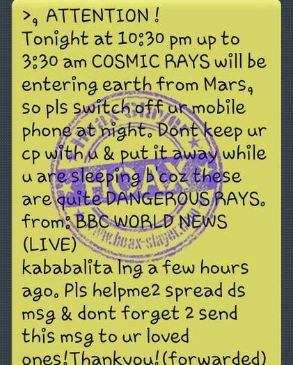 Սոցիալական ցանցերում ակտիվորեն տարածվում է 8 տարվա հնության կեղծ հայտարարություն-կոչ։ Նշվում է, թե 00:30-ից 03:30-ն ընկած ժամանակահատվածում արևի վտանգավոր ճառագայթումից խուսափելու համար հարկավոր է անջատել բջջային հեռախոսներն ու պլանշետները և քնելիս դրանք պահել մարմնից հեռու։ Հայտարարությունն ավելի ազդեցիկ դարձնելու համար՝ նշվել է, թե կոչն արել է անձամբ ՌԴ նախագահ Վլադիմիր Պուտինը։ Այս հայտարարությունը շրջանառվում է նաև տարբեր հավելվածների հաղորդագրություններում։
