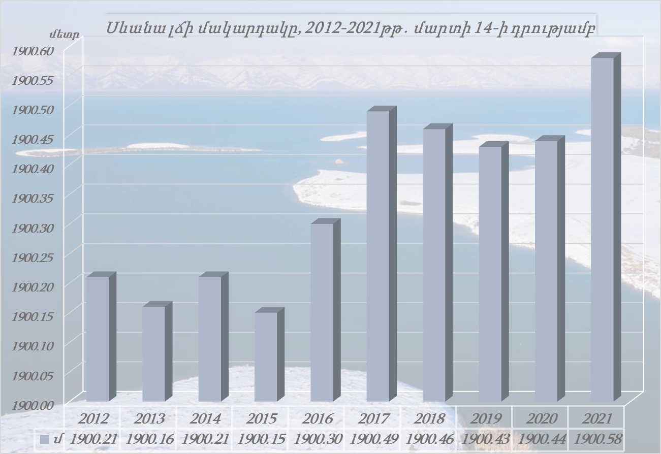Նշվում է, որ Սևանի մակարդակը մարտի 8-ից 14-ն ընկած ժամանակահատվածում բարձրացել է 1 սանտիմետրով և կազմել` 1900.58 մետր (14.03.21թ.), որն անցյալ տարվա նույն օրվա մակարդակից բարձր է 14 սանտիմետրով, իսկ 2021 թվականի հունվարի 1-ի մակարդակից՝ 6 սանտիմետրով։