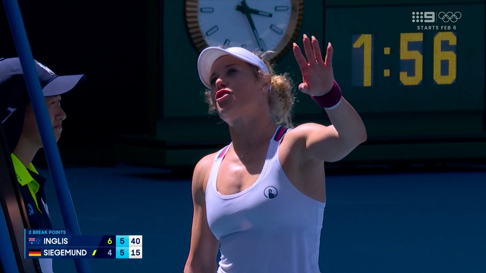 Լարվածությունը սկսվեց այն պահին, երբ Զիգեմունդը՝ փորձառու գերմանացի թենիսիստուհին, տուգանվեց ժամանակի խախտման համար: Նրա դեմքին երևում էր հիասթափությունը, և նա վիճարկեց որոշումը, սակայն մրցավարի որոշումը մնաց անփոփոխ: Այնուհետև Զիգեմունդը, կարծես թե, հուզված այդ որոշումից, կատարեց մատուցում, երբ Ինգլիսը դեռ պատրաստ չէր, ինչը առաջացրեց խառնաշփոթ կորտում: