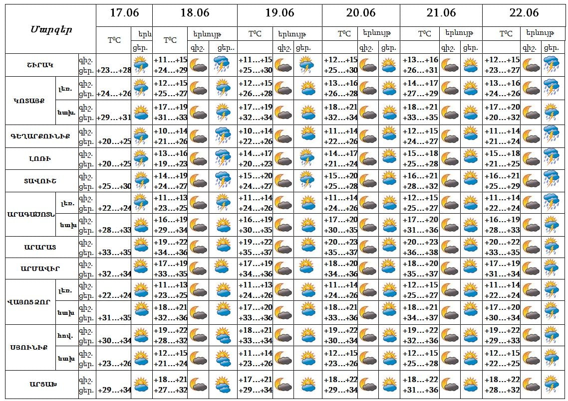 Հունիսի 18-19-ի գիշերը և կեսօրից հետո առանձին շրջաններում, 22-ին շրջանների զգալի մասում սպասվում է անձրև և ամպրոպ: Առանձին հատվածներում սպասվում է նաև կարկուտ: Հունիսի 20-21-ը սպասվում է առանց տեղումների եղանակ:
