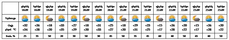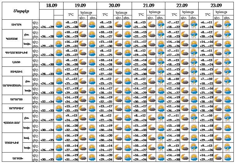 Սեպտեմբերի 18-ի ցերեկը, 19-20-ը սպասվում է առանց տեղումների եղանակ: Սեպտեմբերի 21-23-ի կեսօրից հետո առանձին շրջաններում սպասվում է կարճատև անձրև և ամպրոպ: