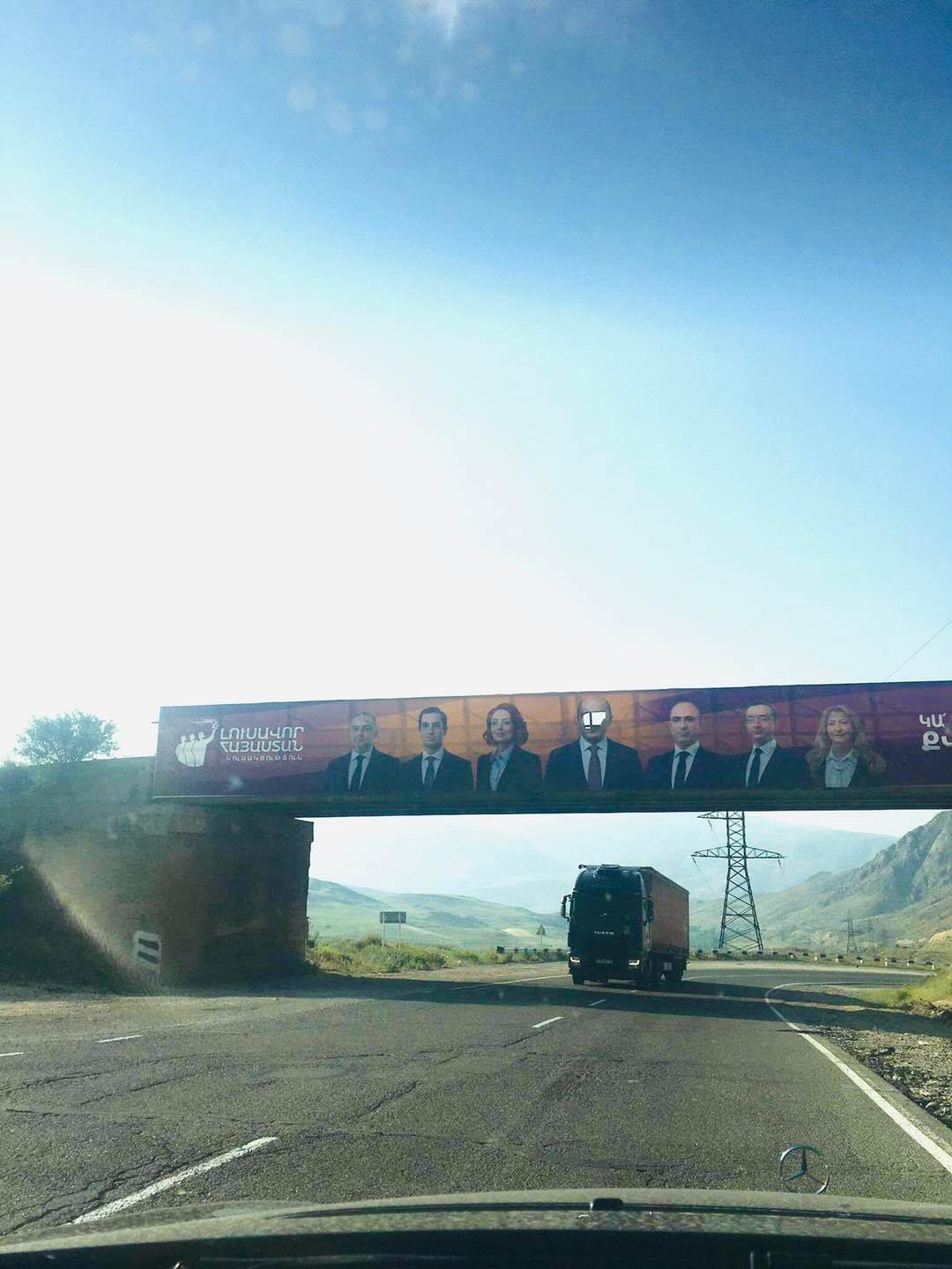 Ճանապարհահատվածներից մեկի վերնամասում տեղադրված «Լուսավոր Հայաստանի» պաստառի այն մասին, որտեղ պատկերված է Էդմոն Մարուքյանի դեմքը, պատռել են։