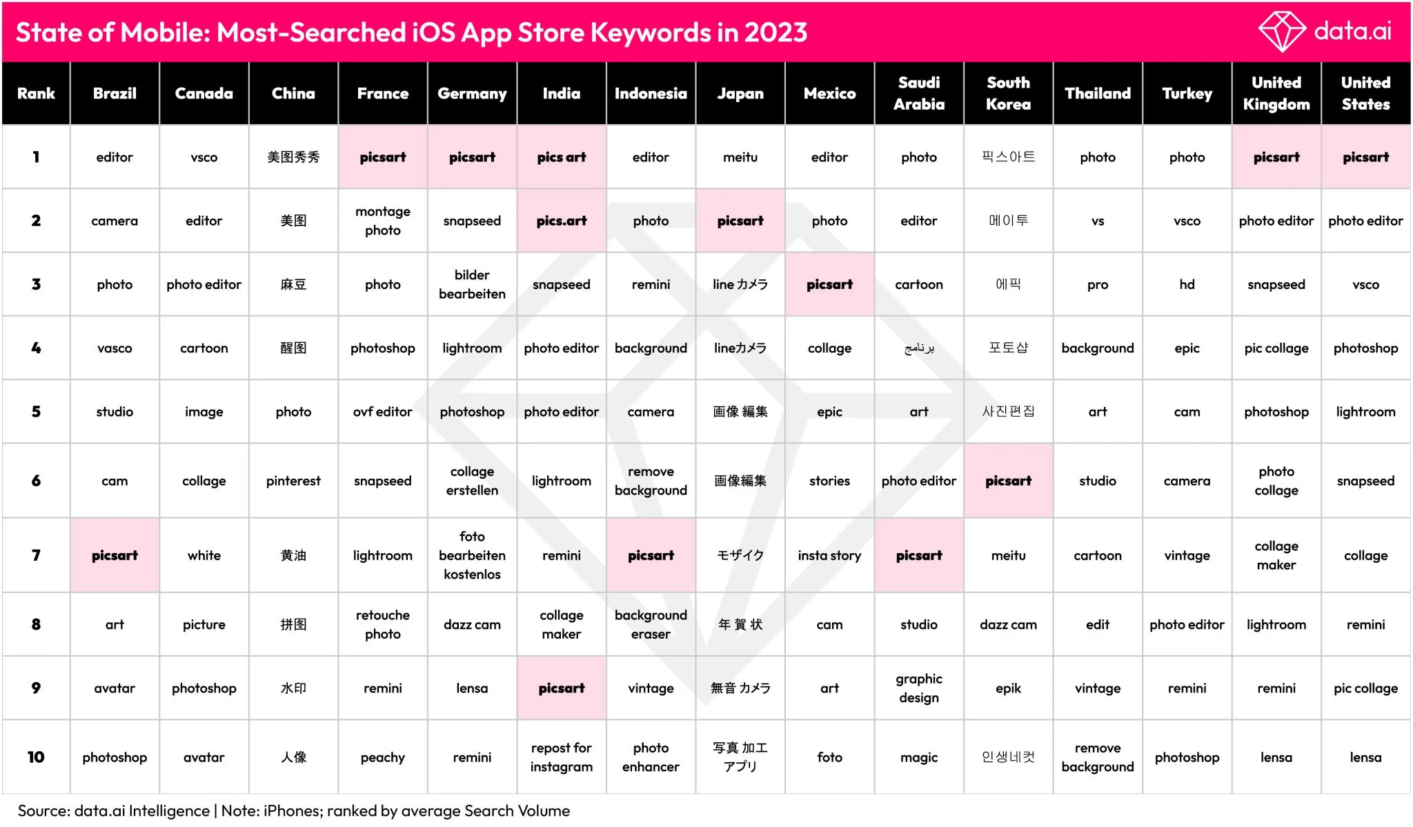 Picsart-ն App Store-ում լուսանկարների խմբագրման ամենաշատ որոնված եզրույթն է դարձել այնպիսի խոշոր շուկաներում, ինչպիսիք են ԱՄՆ-ը, Մեծ Բրիտանիան, Ֆրանսիան, Գերմանիան, Հնդկաստանն և Ճապոնիայում (2-րդ տեղը)՝ գերազանցելով նույնիսկ ընդհանուր եզրույթները, ինչպիսիք են «խմբագրել»-ը, «կոլաժ»-ը և «լուսանկար»-ը, այս մասին Linkedin-ի իր էջում գրել է Picsart-ի հիմնադիր Հովհաննես Ավոյանը։
