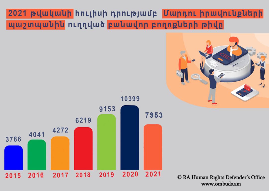 «2021 թվականի հուլիսի դրությամբ Մարդու իրավունքների պաշտպանին ուղղված բանավոր բողոքների թիվը, այդ թվում՝ թեժ գծի հեռախոսահամարներին ստացված զանգերը կազմել է 7953: