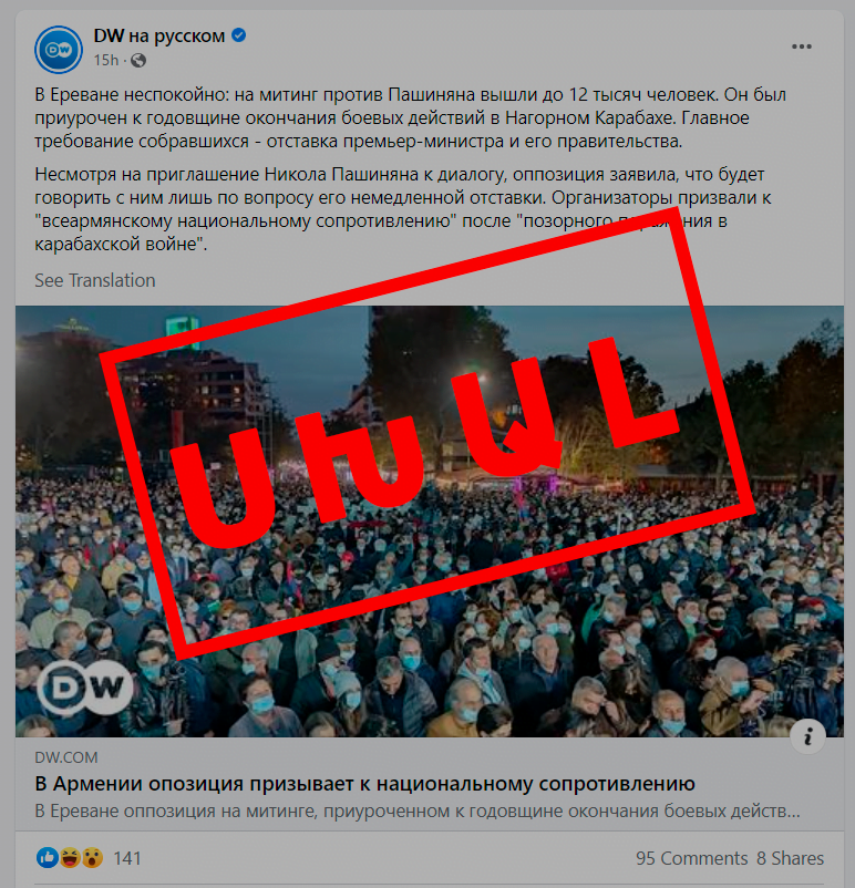 Գերմանական Deutsche Welle-ի ռուսական ծառայությունը՝ լուսաբանելով երեկ՝ նոյեմբերի 8-ին, Ազատության հրապարակում կայացած «Հայաստան» դաշինքի հանրահավաքը, սխալ ինֆորմացիա է հրապարակել։