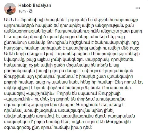 Քաղաքական մեկնաբան Հակոբ Բադալյանը Facebook-ի իր էջում գրել է․