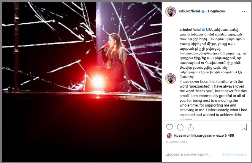 Մեկնաբանություններում շատ հետեւորդներ իրենց աջակցությունն են հայտնել երգչուհուն ու շնորհակալություն հայտնել երկիրը պատվով ներկայացնելու համար։ «Եվրատեսիլ 2019»-ի երկրորդ կիսաերզափակիչը տեղի է ունեցել երեկ՝ Թել Ավիվում։ Սրբուկը երաժշտական մրցույթին ներկայացրել է «Walking out» երգը։