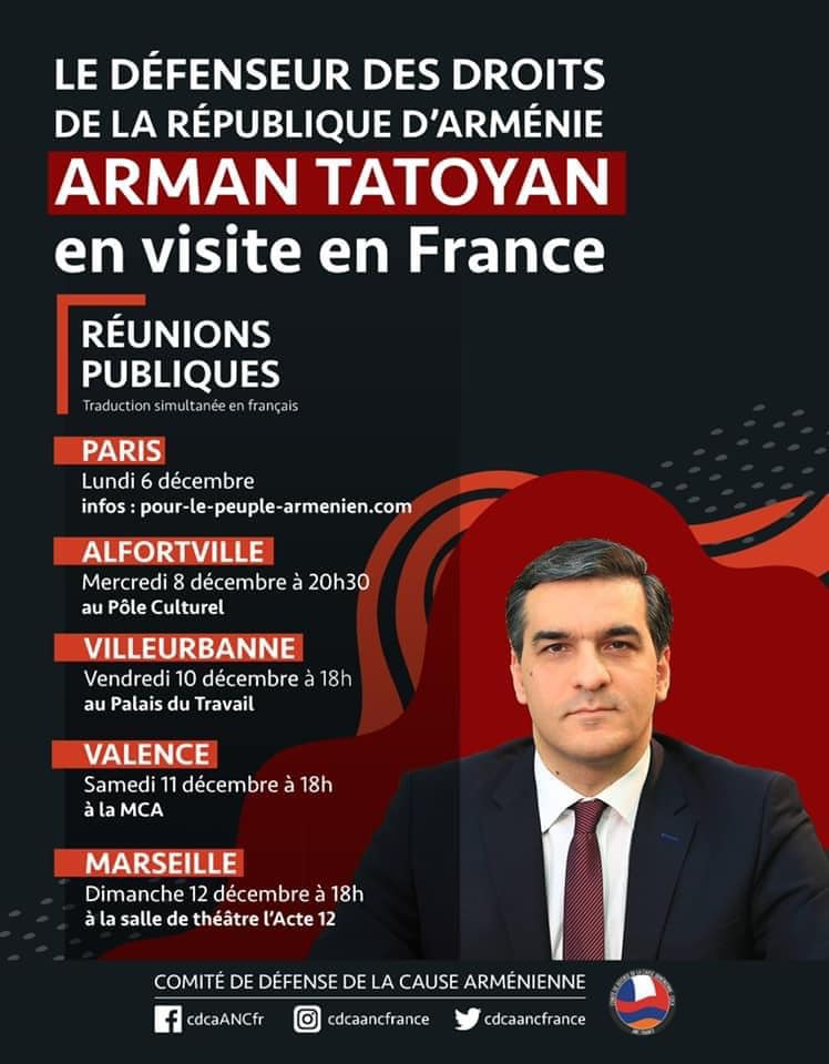 Հայաստանի Հանրապետության մարդու իրավունքների պաշտպան Արման Թաթոյանը՝ Ֆրանսիայի Հայ դատի հանձնախմբի հրավերով մեկնում է Ֆրանսիա։