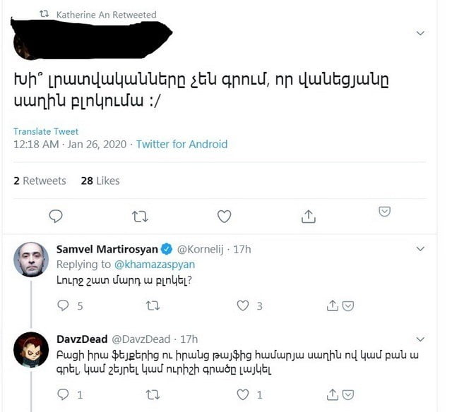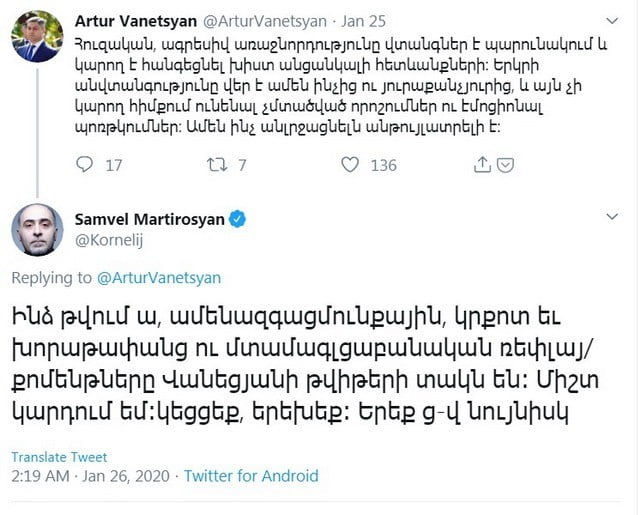 Մարտիրոսյանի խոսքերով. «Ենթադրում եմ, որ ծրագրել էին մուտք գործել Թվիթեր ու ստանալ նույն դրական արձագանքը, ինչ իրենց կողմնակիցներինը, բայց հանդիպեցին գուցե փոքր, բայց «կուռ» ցինիկների, ու չկարողացան աշխատել ու միակ ելքը գտան արգելափակելով, ու Վանեցյանի անունն այդպես էլ մնաց՝ «բլոկ անող թվիթերյան պրոֆիլ»: Եվ հիմնական քննարկումները դրա շուրջ են, այլ ոչ թե ինչի մասին է գրում Վանեցյանը, առավել ևս, որ շատերը չեն էլ տեսնում ինչ է գրում, արգելափակված և կարծես այդ թիվն ավելանում է»: