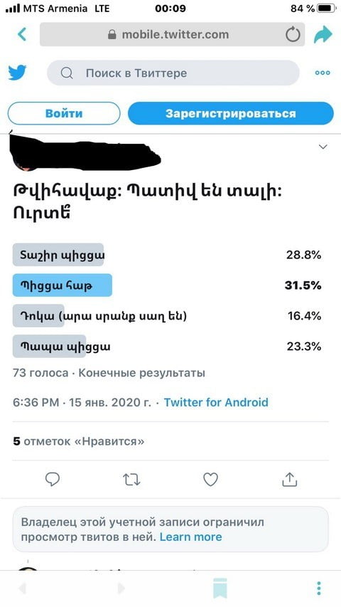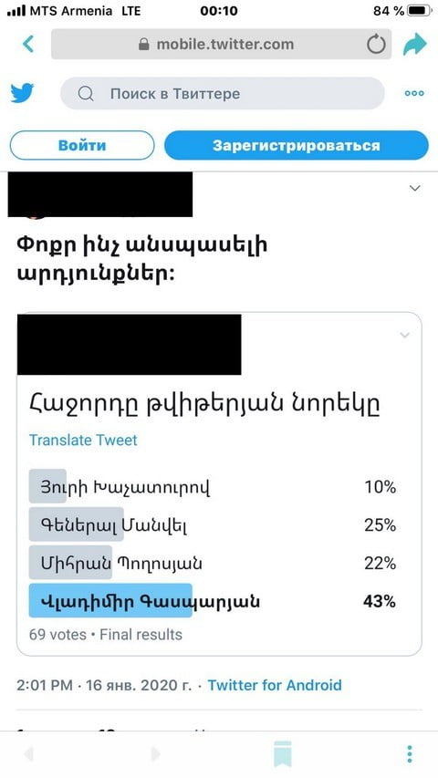 Նրա առաջին թվիթին ի պատասխան, օգտատերերը հիշեցրին Հատուկ քննչական ծառայության պետ Սասուն Խաչատրյանի հետ գաղտնալսումը, խորհուրդ տալով. «Օգտվեք տելեգրամից, էնտեղ չեն գաղտնալսում»: