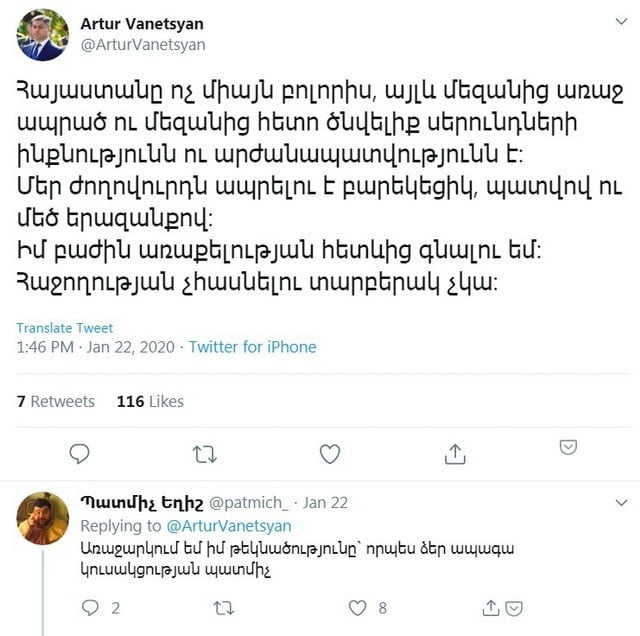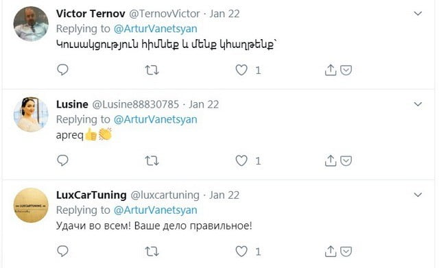 Վանեցյանի թվիթերյան էջում նրան նաև ողջունող ու սատարողներ կան: