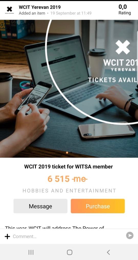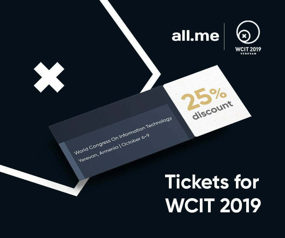Օտարերկրյա մասնակիցների համար տոմսերի ստանդարտ գինը կազմում է 695 դոլար և 495 դոլար ՝ ՀՀ բնակիչների համար: Եթե դուք արդեն all.me օգտատեր եք, բացեք հավելվածը և գտեք WCIT- ի պաշտոնական էջը: Այստեղ կտեսնեք տոմսեր, որոնք կարելի է գնել meMarket բաժնում: Սեղմեք տոմսի վրա, այնուհետև `«գնել»-ու վրա: Գնման մանրամասները պարզելու համար վաճառողը կկապվի ձեզ հետ: